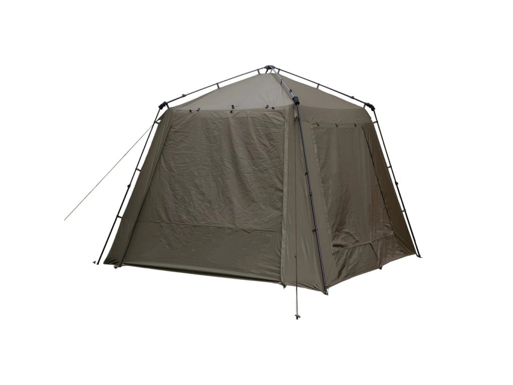Multifunkční rybářský přístřešek Gazebo XL lze využít jako společenské centrum pro více rybářů, kuchařské zázemí nebo jako prostorný bivak. Nabízí dostatek prostoru pro každodenní nezbytné činnosti za jakéhokoliv počasí a navíc hromadu prostoru pro uložení vašeho dalšího rybářského vybavení. Hliníkové, teleskopické tyče Speedup poskytují robustní rám a umožňují, aby se přístřešek sbalil do kompaktní, pro jednu osobu zvládnutelnou velikost. Výška dveří byla posunuta co nejvýše, aby byla zajištěna maximální průchodnost. Dveře lze nastavit tak, aby byly plně otevřené, zavřené moskytiérou nebo plně uzavřené proti dešti. Kromě toho lze dveře použít pro vytvoření zastřešené verandy před samotným bivakem, která nabízí ochranu před ostrým sluncem. Další tři strany přístřešku můžete otevřít a srolovat nebo ponechat pouze moskytiéru. Každá ze stran je také vybavena systémem Adaptive Ventilation®, díky čemuž můžete udržovat v bivaku cirkulaci vzduchu, abyste snížili teplo a kondenzaci, a přitom se dovnitř nemohla dostat voda, když prší.