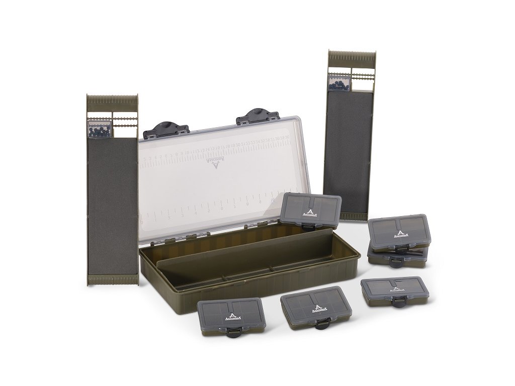 Uložte své návazce profesionálně. Na dvě desky se vám vejde minimálně 32 návazců. Díky špendlíkům, které jsou součástí balení můžete přichytit i návazce abnormálně dlouhé. U vody si pak vybere ten, který je podle vás v daný den nejlepší. Do šesti malých krabiček, které jsou dále rozděleny můžete uložit téměř vše. Přihrádky jsou různě velké, abyste do nich mohli dát od háčků, přes karabinky, až po větší věci jako jsou olůvka. Tyto boxy se dají naskládat do velké krabičky, nebo je můžete nosit zvlášť, je to jen na vás! Na víku je zvýrazněný metr, který vám pomůže změřit délku jednotlivých komponentů montáže.