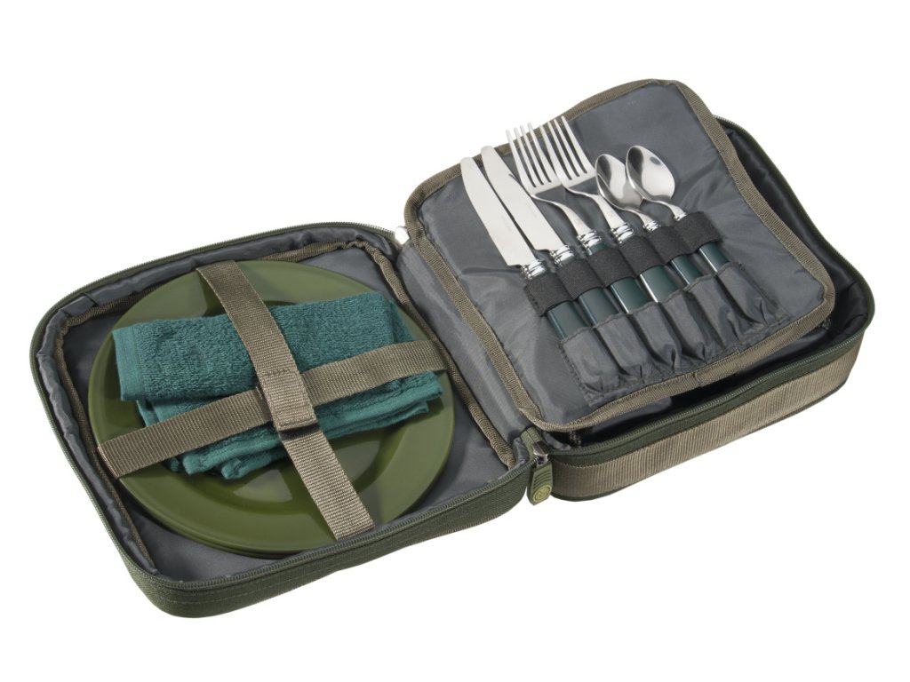 Sada kvalitního jídelního příslušenství. Obsahuje froté utěrku, talíře z velmi odolného plastu, kompletní příbory, nerezové termohrnky a nerezové dózy na cukr a sůl s kvalitním těsněním. Vše je zabaleno v kvalitním polstrovaném pouzdru se zipem a transportním uchem.