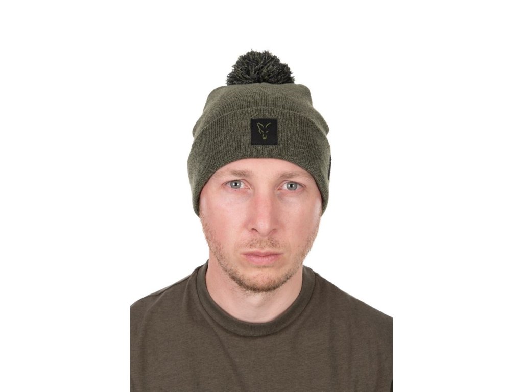 Zeleně melírovaná čepice s černou bambulí.