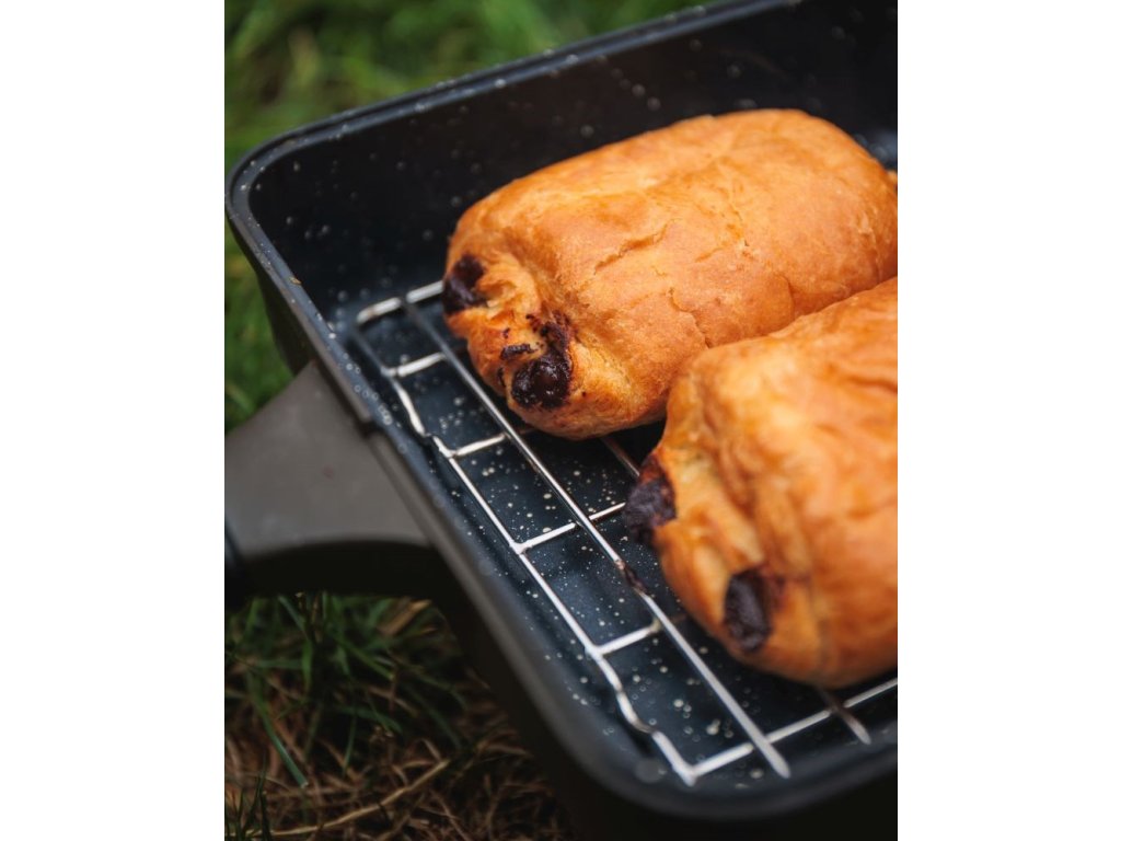 * Součástí je mřížka z nerezové oceli omezující kontaktu připravovaných sladkostí a pizzy s povrchem pánve, omezuje tak jejich připálení.
