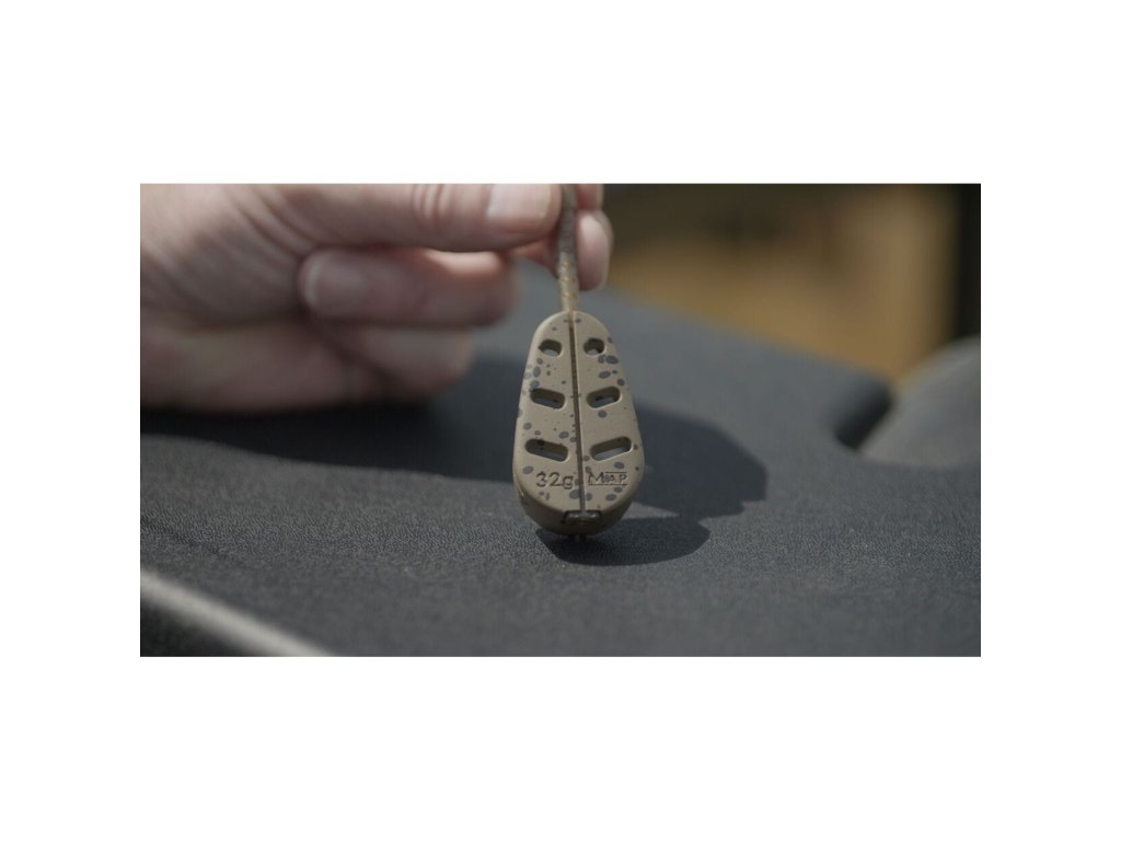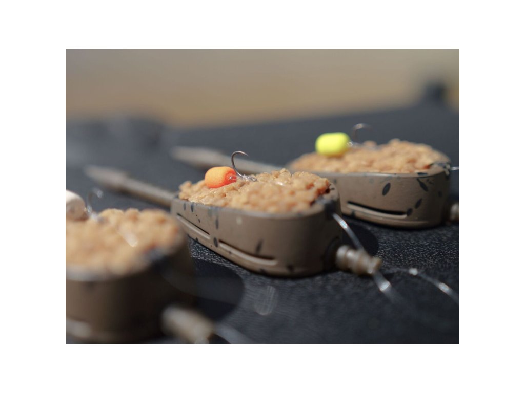 Integrovaná spona vám umožňuje nastavit délku vlasce s háčkem a směr hrotu háčku a snadno se uvolní ze sevření, když je ryba chycena. Každé krmítko je plněno zepředu, aby byla zajištěna maximální vzdálenost a přesnost náhozu, a je vybaveno chytře navrženou šikmou základnou, která vytváří menší výtlak vody, když krmítko dosedne na hladinu vody. Tato nakloněná základna nejen chrání návnadu v krmítku před uvolněním a vypadnutím při dopadu při nahazování, ale také vytváří méně hluku při dopadu, což vytváří nerušivý zvuk při vstupu do vody. Dalším chytrým designem jsou spodní otvory na krmítku, protože nejsou pouze zúžené, aby zajistily pomalejší uvolňování návnady, ale jsou natočeny v opačném směru, než je směr, ve kterém krmítko dopadá, čímž opět chrání návnadu uvnitř při vstupu do vody. Každé krmítko má také vyměnitelný design, takže krmítka lze rychle měnit, aniž by bylo nutné návazec rozebírat.