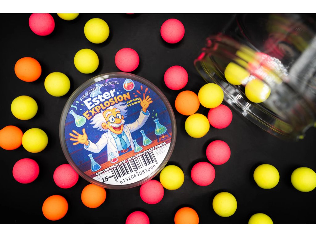 * Prudké, intenzivní, těkavé, VÝBUŠNÉ! Ester Explosion je výsledkem neúnavného experimentování – kombinace více esterů s pečlivě vybranými organickými kyselinami za účelem vytvoření skutečně extrémní podvodní reakce, která si vyžádá pozornost každého kapra v okolí. Smícháním dvou našich nejosvědčenějších esterových profilů, Esterblend a Acid Pear, jsme se posunuli daleko za hranice toho, co je v současnosti na trhu k dispozici. Tyto vícebarevné pop-up nástrahy (mix barev v jednom kelímku) byly vytvořeny a uvedeny na trh exkluzivně k 30. výročí Carp Den Bosch v roce 2026 a nelze je ignorovat. Dříve či později si najdou místo ve vašem kbelíku s návnadami.