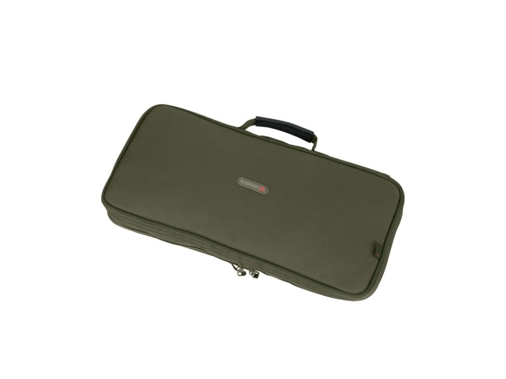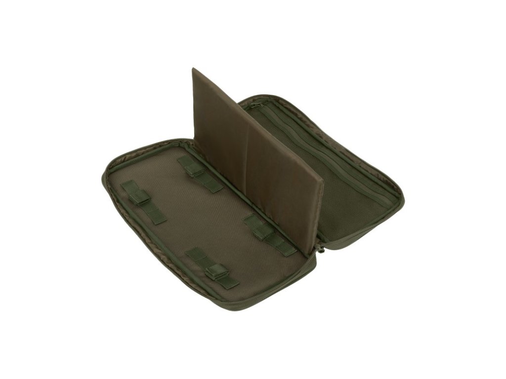 Pouzdro obsahuje vnitřní kapsu na zip pro uložení dalších nezbytností, jako jsou náhradní baterie nebo indikátory záběru. Uvnitř najdete nastavitelné popruhy pro upevnění různých velikostí hrazd. Vnitřní, ochranná část odděluje signalizátory od kapsy na příslušenství a na zadní straně na ní naleznete elastické smyčky pro uložení šesti vidliček.