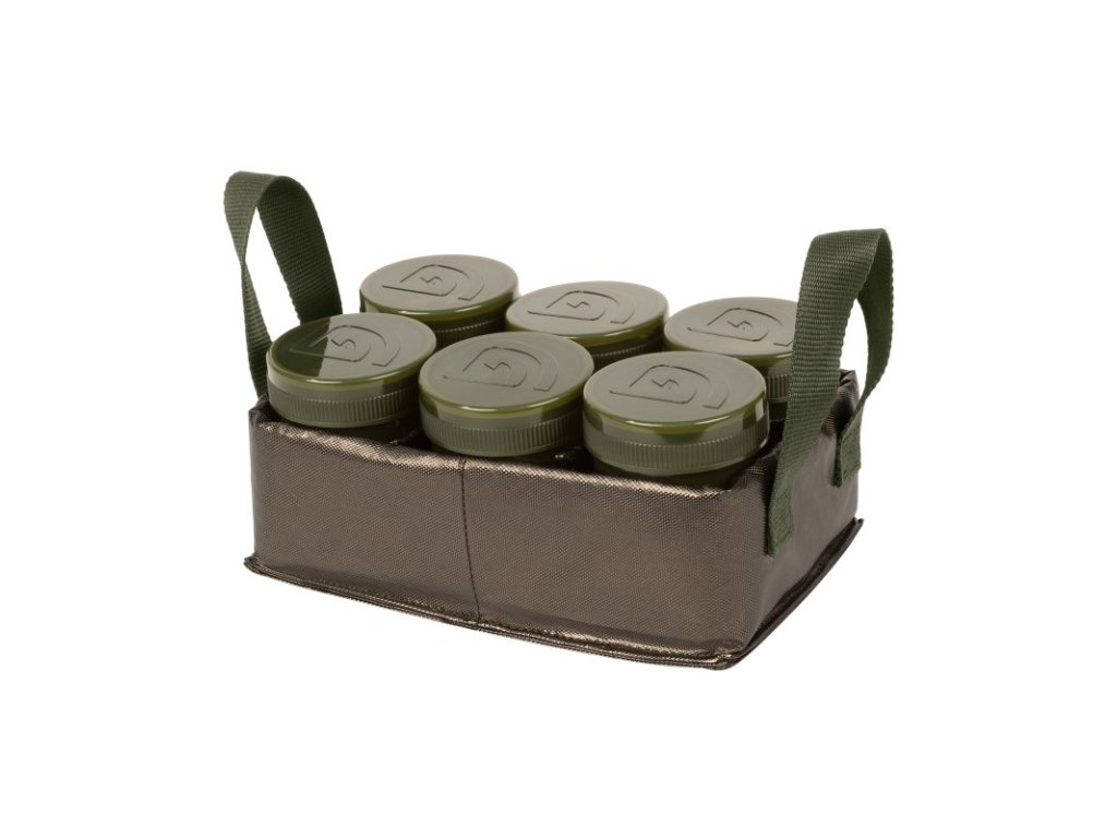 Taška je dodávána s šesti nepropustnými dózami, uloženými v izolovaném, vyjímatelném podnosu, což vám umožňuje uložit další návnady nebo vybavení v hlavní přihrádce, která je vystlaná vysokohustotní, termální podšívkou Chilla a odnímatelným PVC vnitřkem, který lze snadno vyčistit.