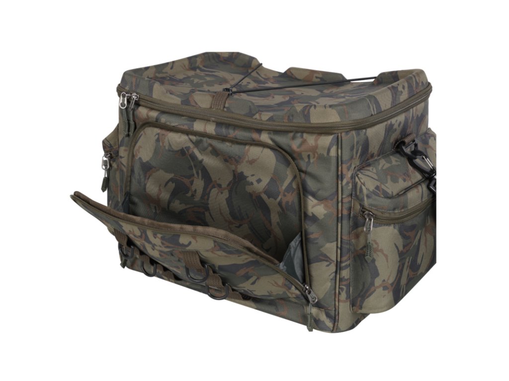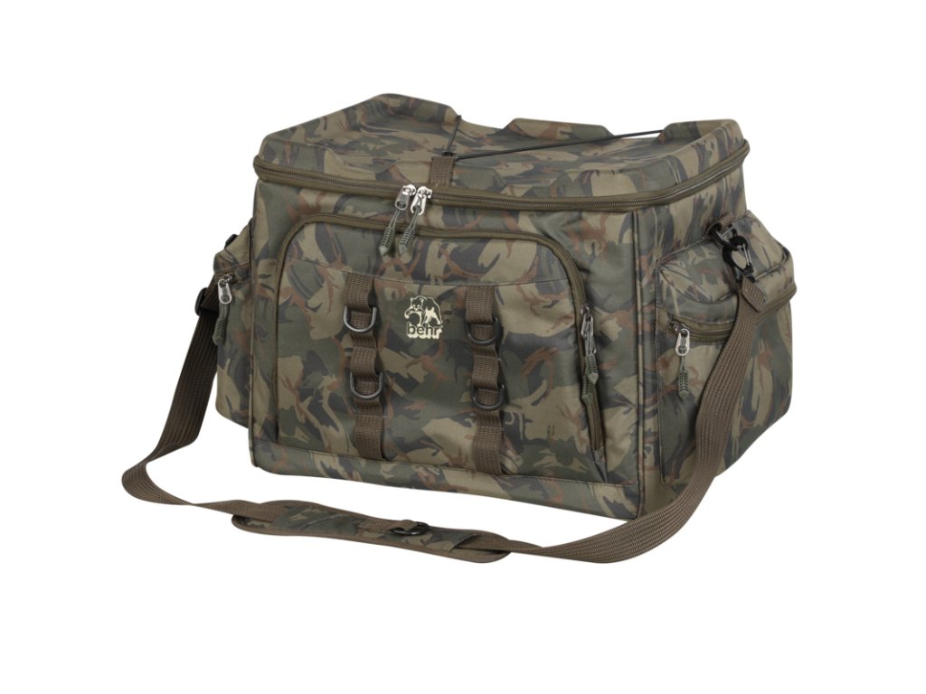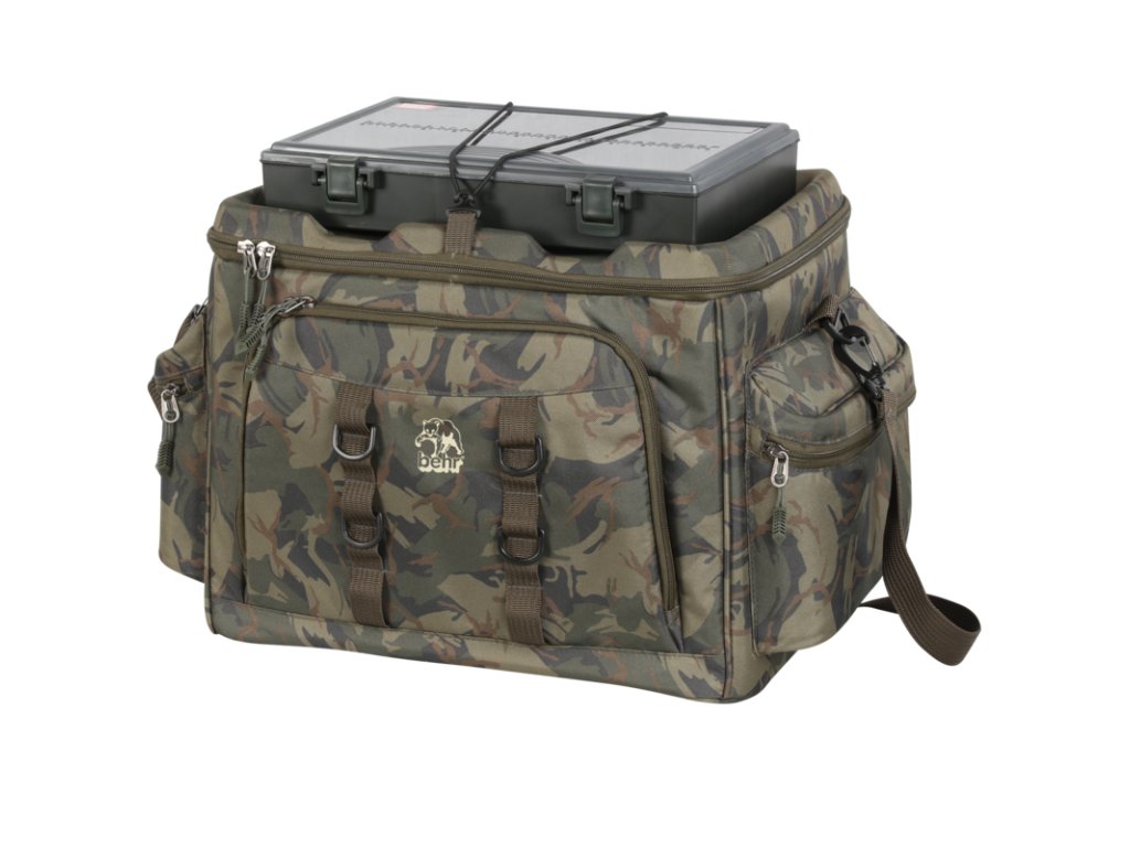 Behr rybářská taška Specimen Bag Large Camou je praktickým pomocníkem pro každého rybáře, který potřebuje více místa na své vybavení a zároveň hledá stabilní pracovní plochu při pobytu u vody. Díky pevné vrchní základně ji lze využít jako improvizovaný stolek a elastické popruhy vám pomohou přichytit plastový box nebo náhradní oblečení.