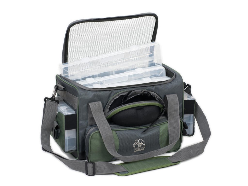 Hlavní kapsa pojme 4 velké plastové boxy na nástrahy a dva menší boxy jsou uložené po stranách tašky. Na přední straně najdete zvláštní kaspu na brýle a jednu větší na drobnosti. Samozřejmostí je nastavitelný popruh přes rameno a popruhy do ruky.